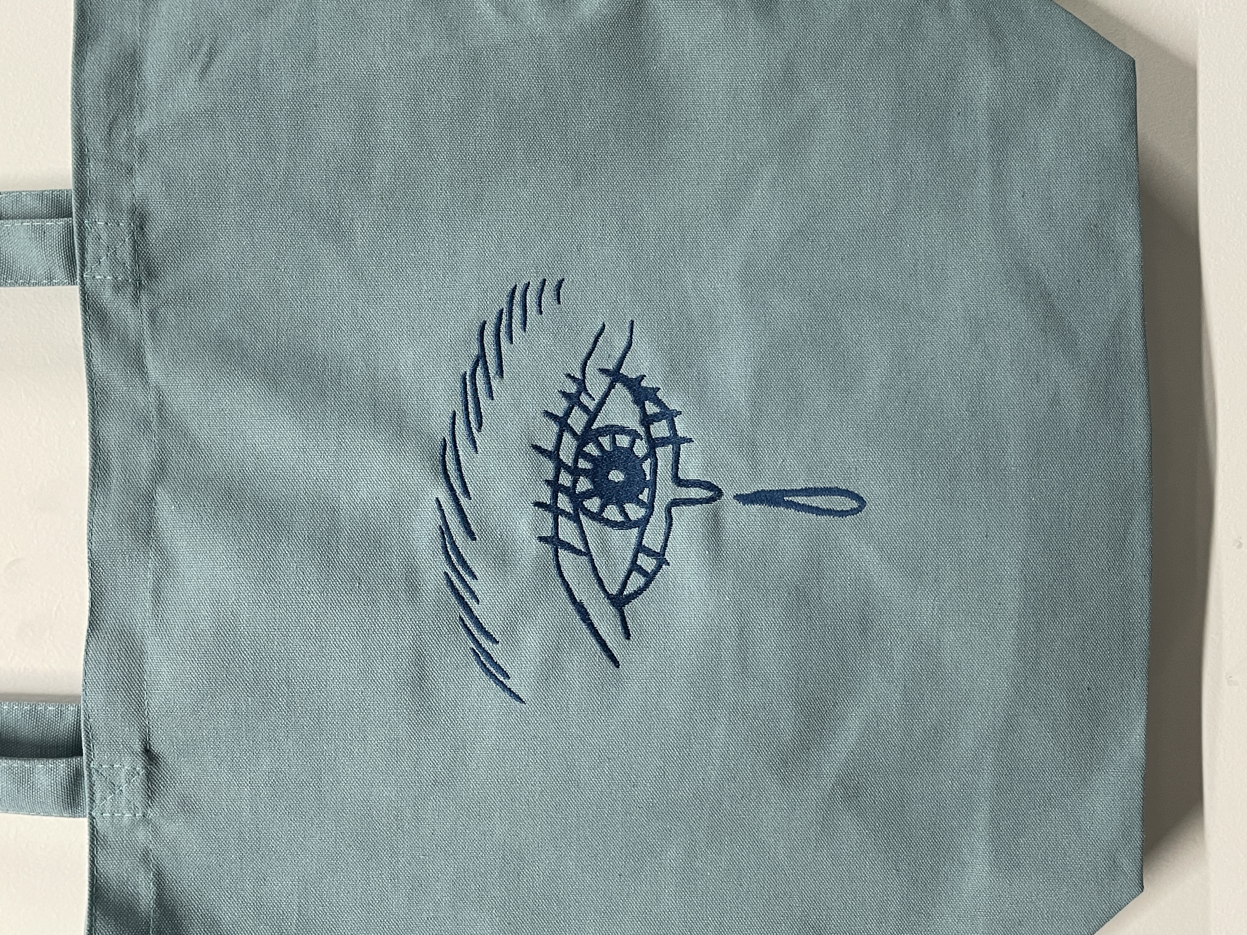 “There is so much going on right now that is worthy of tears, both in our individual lives as queers and in the many overlapping violences of the current geopolitical landscape. I drew a crying eye for the many tears this moment of history provokes, for the melancholy, the despair, the feelings of hopelessness so many of us carry around. I also thought about the many feelings and emotions that surface when we read, when we are in bookstores and in libraries. The bag is large; it can fit many books and magazines. I like to think about it as a book bag for queers with tears. ”